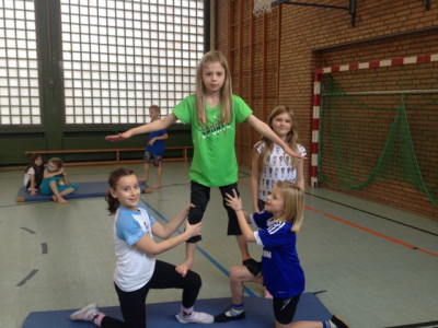 Im Sportunterricht bauen die Schüler und Schülerinnen der Klasse 3b partnerschaftlich Pyramiden.